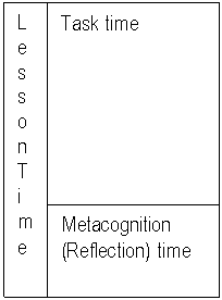 It is clear that the nature of the teacher's role must be carefully understood so that the quality of student discussions is allowed to continue at appropriate times. Secondly the time for debriefing or explicitly discussing metacognitive thinking may be better placed at the conclusion of lesson task time rather than midway through a task. Students may make significant gains if a more structured approach to teacher input allowed clear times or parts of the lesson, when metacognitive processing would be explicitly discussed. This may be shown by Figure 3.