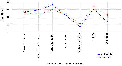When a comparison of perceptions were made between instructors and students, the following were observed. The same pattern observed in previous research that is, instructors always perceiving their classroom more positively, was less apparent at the tertiary level, (see Figure 4). Tertiary instructors clearly perceived their environment more favourably in only three of the seven scales; Personalisation, Student Cohesiveness and Task Orientation. A possible explanation could be that at the tertiary level, instructors are more in tune with student preferences and the instructors seem to be accommodating to the changes that students undergo in their environment after transition.