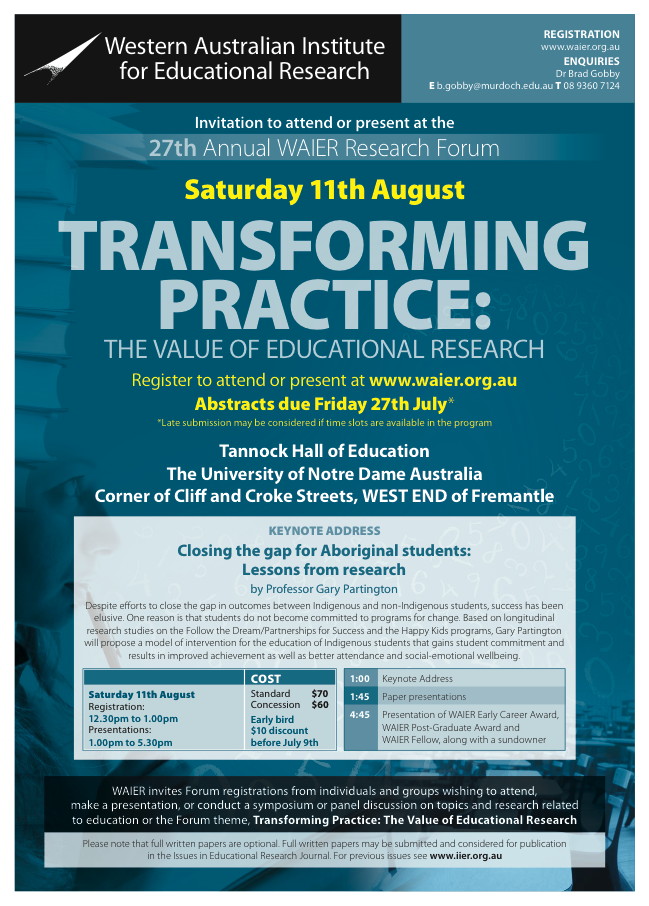 | Submitting an abstract | WAIER invites submissions of abstracts from individuals and groups wishing to attend, make a presentation, or conduct a symposium or panel discussion on topics and research related to education or the Forum theme, Transforming practice: The value of educational research.